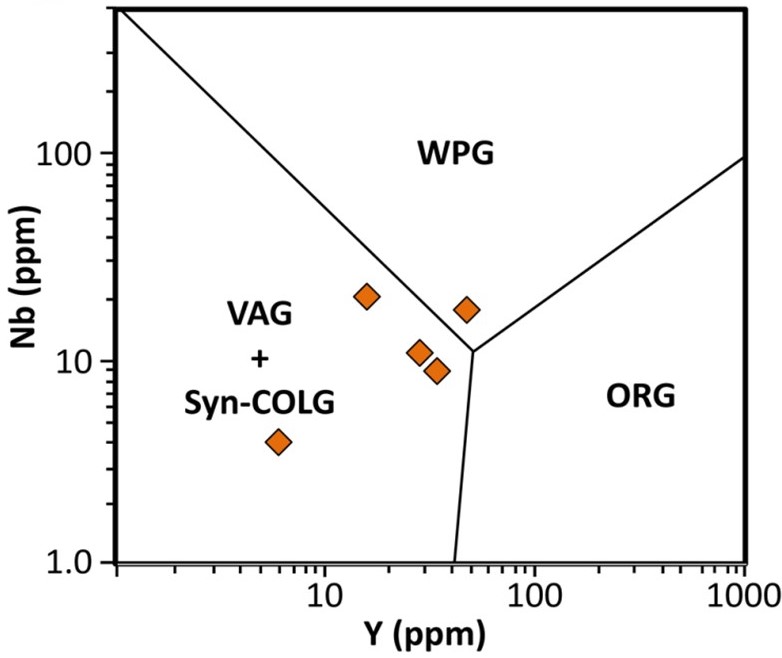The discrimination diagrams shown use the relationships of trace elements to determine the source of granitic melts (Pearce et al., 1984; Pearce, 1996). The pegmatites mainly plot in the Volcanic Arc Granite (VAG) and Post-Collisional Granite (Post-COLG) fields (other fields: ORG - Ocean Ridge Granite; Syn-COLG - Syn-Collisional Granite; and WPG - Within Plate Granite). These data suggest that the pegmatite may have been part of the island arc that collided with the Piedmont ~470 Ma during the Taconic Orogeny or produced shortly thereafter. |