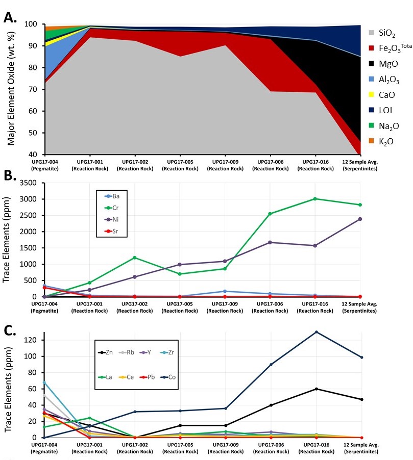 We also examine the geochemistry of the pegmatites, reaction rocks, and serpentinites to identify specific trends in the rocks. The intrusion of the pegmatites into the serpentinites is accompanied by a high amount of heat, pressure, and fluid flow. The fluid flow around these intrusions encourages component exchange and the adjacent rocks become severally altered, as seen in the textures above. .