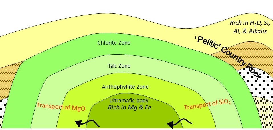 Another problem addressed by this research is the alteration history and mechanism of the ultramafic bodies have given them complex internal structures. Many of the ultramafic bodies of the Piedmont show blackwall alteration. Blackwall alteration is seen when ultramafic or mafic bodies experience incomplete alteration preserving a relatively unaltered core grading into zones of increasing hydration approaching the country rock. Country rock is a source of fluid and silica which alters the bodies into an onion skin morphology.