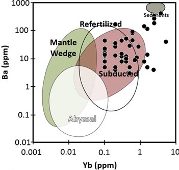 The figure to the right plots the concentrations of ytterbium (Yb) and barium (Ba) of the rocks found in the Pennsylvanian Piedmont. Deschamps et al. (2013) determined specific ratios of these elements in serpentinite samples that were indicative of the setting where these rocks were created. The regions correspond to the following setting: Abyssal  - MORB or ophiolite; Mantle Wedge - mantle derived rocks; Refertilized and Subduction - refer to rocks involved in subduction zone volcanism or island arc settings. The majority of samples plotted on the Yb-Ba discrimination fall within the regions that would suggest an arc setting for the Piedmont ultramafics.