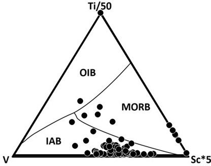 Since not all of our rocks are serpentinites, we look towards other systems for confirmation of our results. Shervais (1981) plotted vanadium (V), titanium (Ti) and scandium (Sc) in basaltic systems to determine the original setting that created the rocks. The fields plotted on the diagram are as follows: IAB - Island Arc Basalt; MORB - Mid-Ocean Ridge Basalt; and OIB - Ocean Island Basalt. In both diagrams the overwhelming signature is that of an island arc setting.