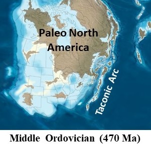 The rocks of the Pennsylvanian Piedmont owe much of their history to the Taconic Orogeny. Approximately 470 Ma in the Ordovician Period, a series of island arcs, created by eastward dipping subduction, collided with the eastern edge of Laurentia (Paleo North America). This collision created a large mountain belt. During the collision over-thickening of the crust metamorphosed, folded, and faulted the rocks. After subsequent phases of orogenesis (the Alleghenian Orogeny), the mountains eroded and eventually expose the rocks seen in the Piedmont today. The image to the left is a paleographic map from Ron Blakey.