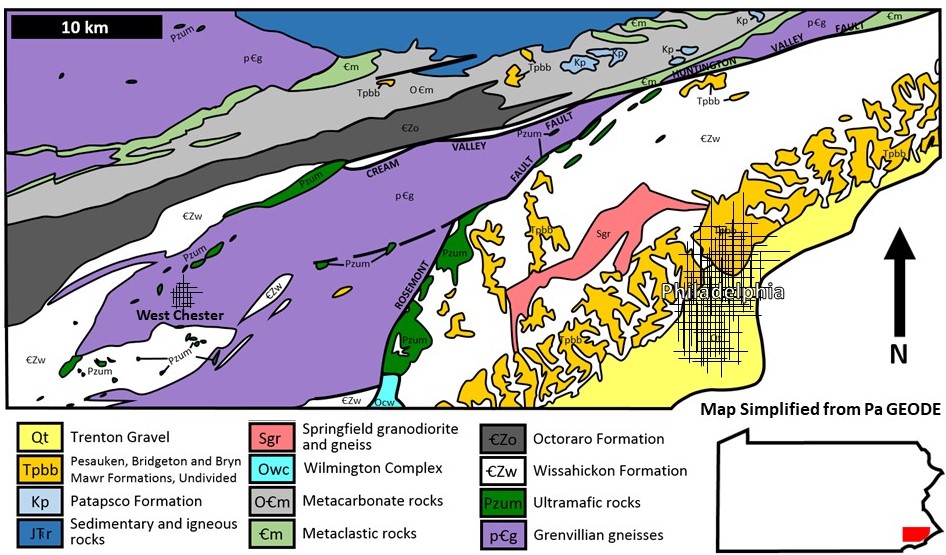 Above is a generalize regional map of southeastern Pennsylvania showing the location of ultramafic rocks (green).  There are approximately 75 ultramafic bodies mapped in the Pennsylvanian Piedmont, however, much of the outcrops are now covered by urban development and sprawl. Our group has examined 15 of the ultramafic bodies that are accessible and have completed detailed studies. In the This research aims to resolve how these ultramafic rocks were created, their alteration history, and how they became exposed in the Pennsylvanian Piedmont.