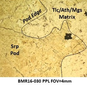 Most rocks at the ultramafic bodies have been metamorphosed showing complete replacement and shear textures